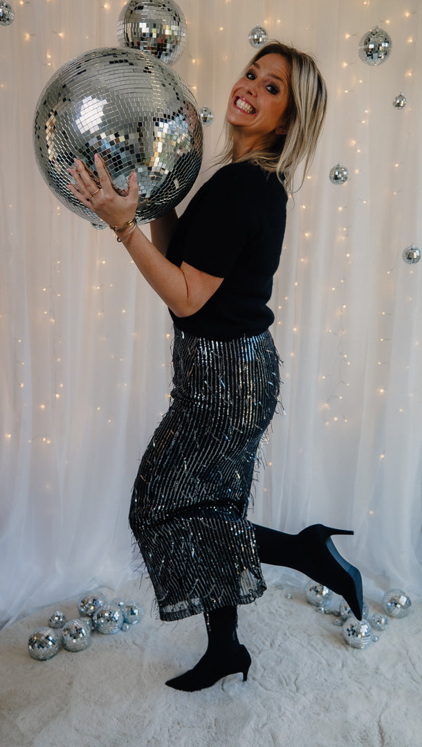 Een lange glitterrok met rekker aan de taille, zit heel comfy! Combineer met een basic pull of met een zwarte top en blazer!😍