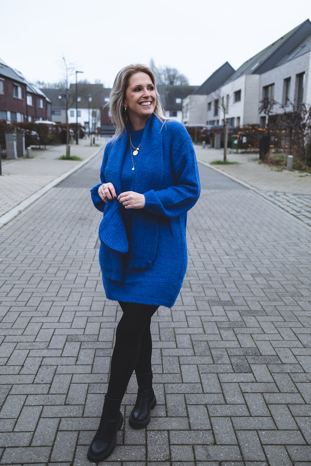 Een lange trui die je perfect als jurk kan dragen met een donkere panty. Bij deze trui zit een sjaal en muts bij! TU en past van maatje S tot een ruime L.