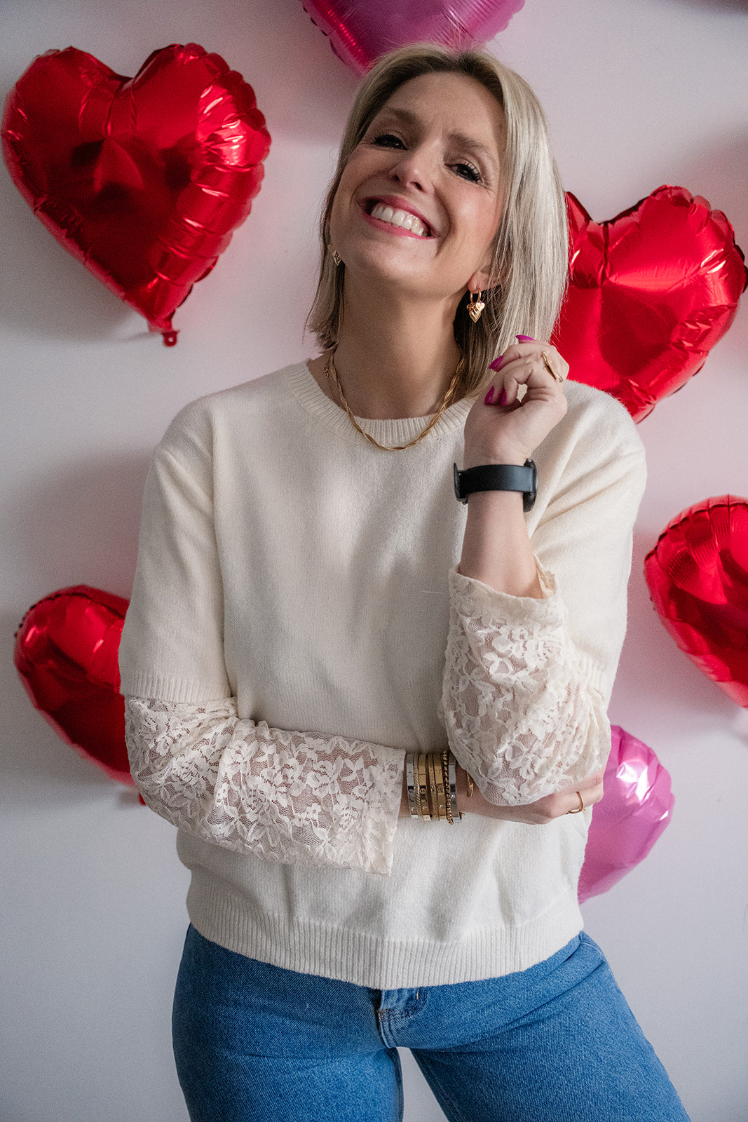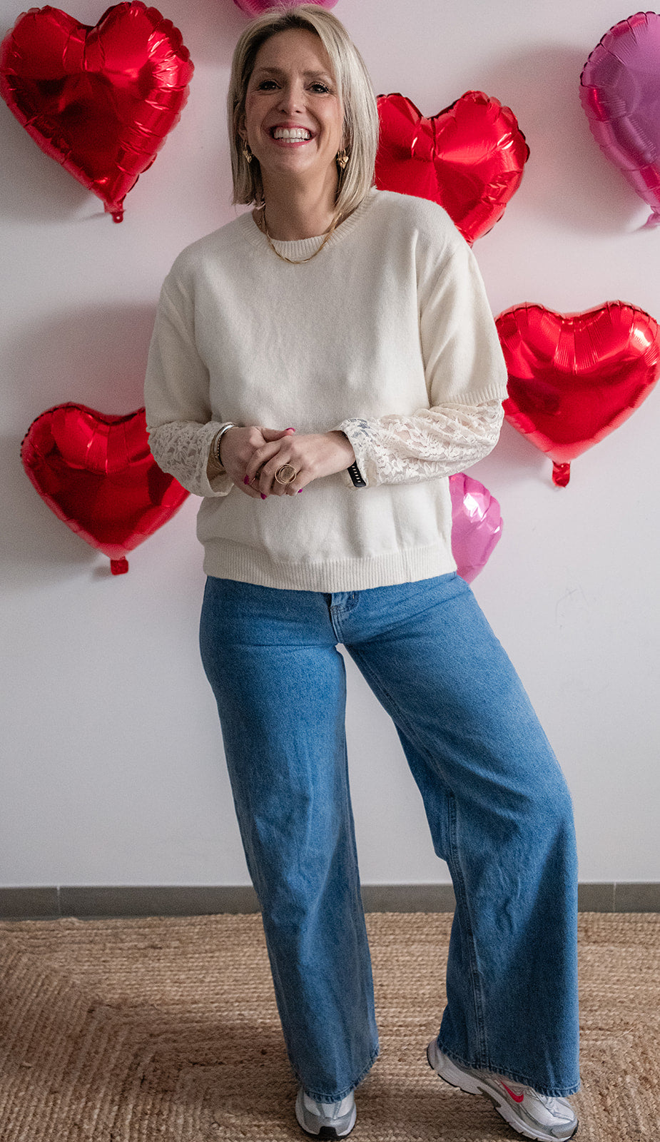 Een basic trui in ecru kleur met net dat ietsje extra, door de kanten mouwen krijgt deze trui een romantische vibe!