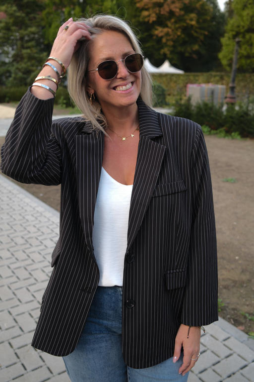 Zwarte oversized blazer met witte strepen.