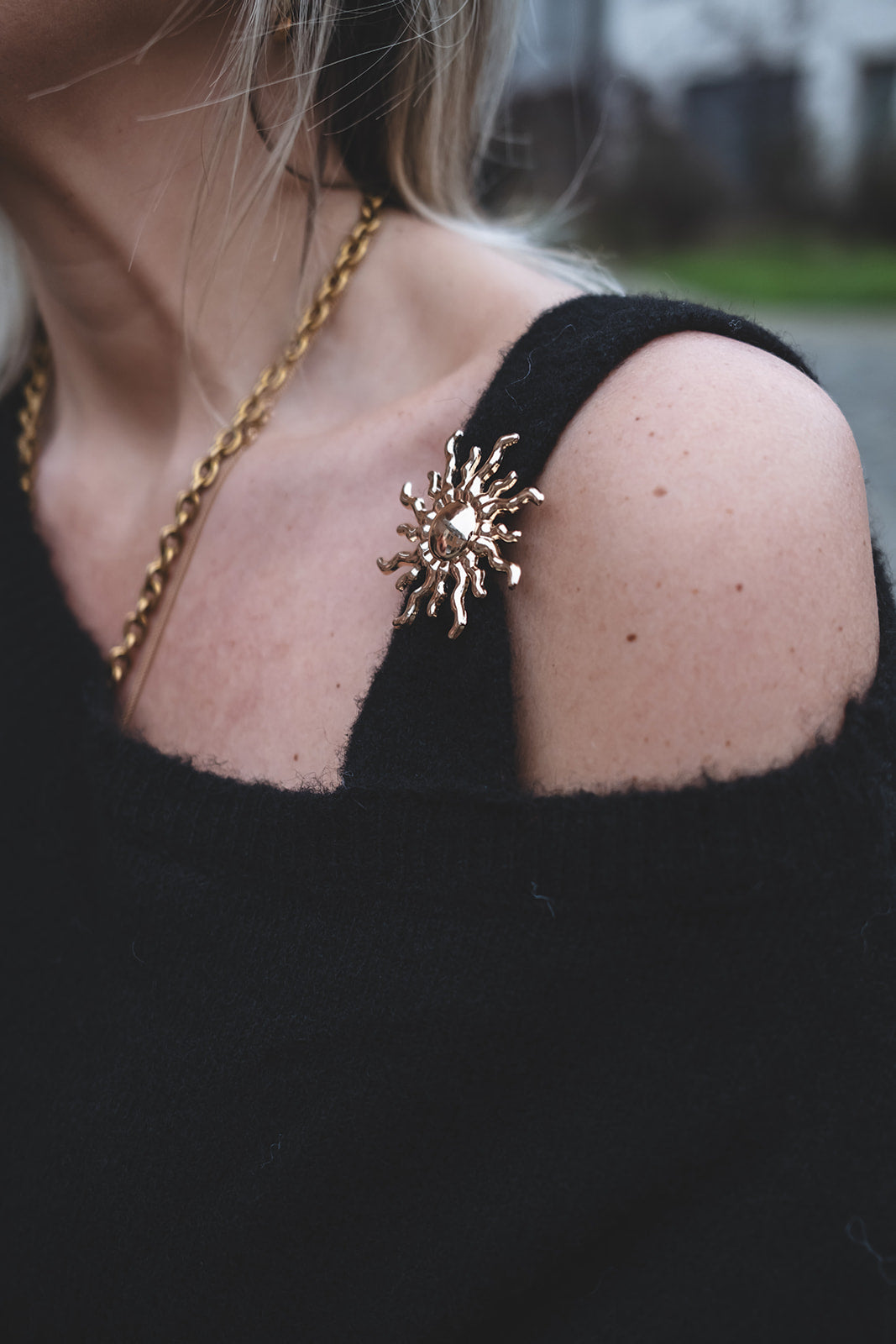Een zalige zachte trui met een extra leuk accent: een zonnetje op de schouder! TU en kan van maatje S tot XL.