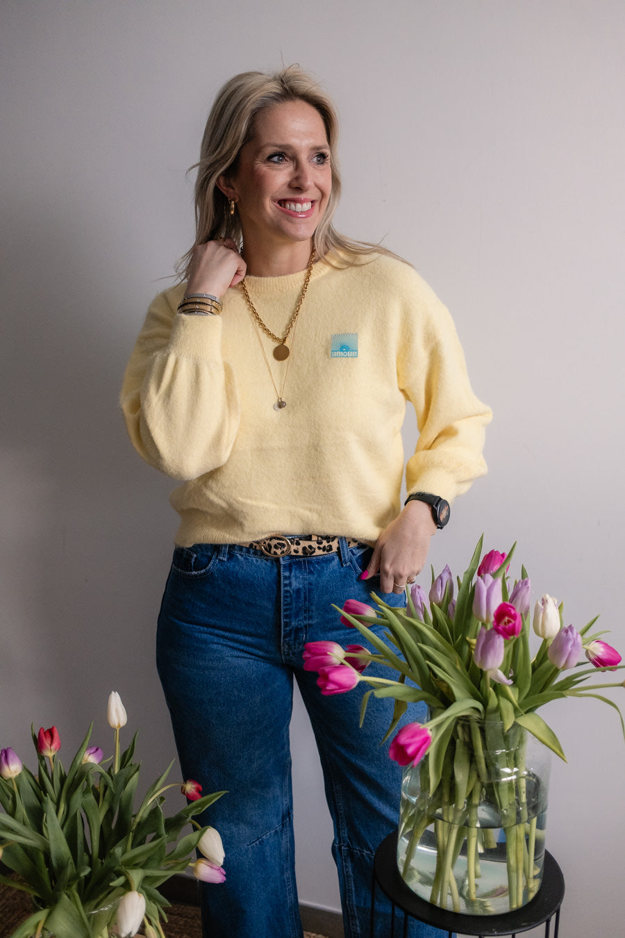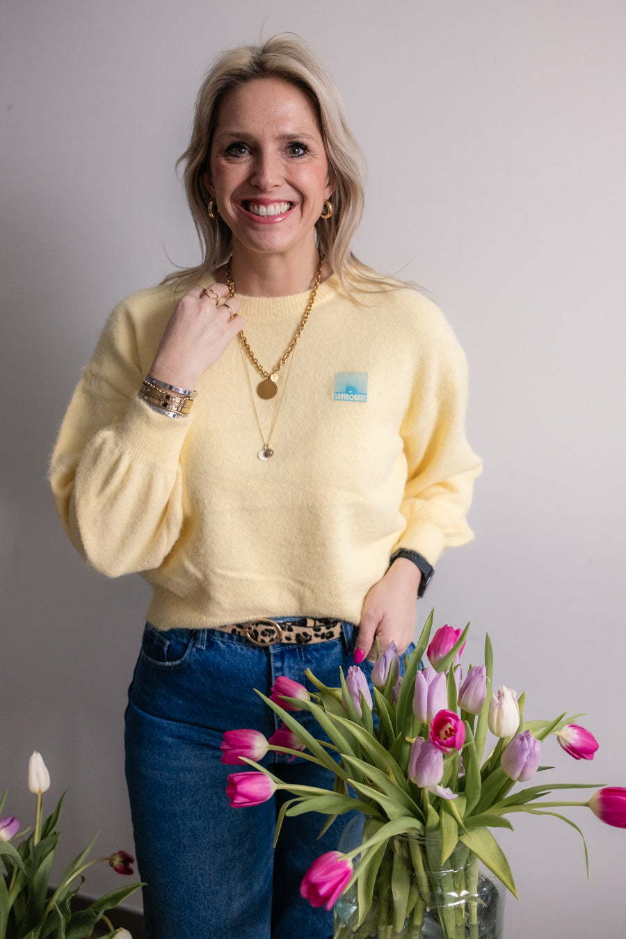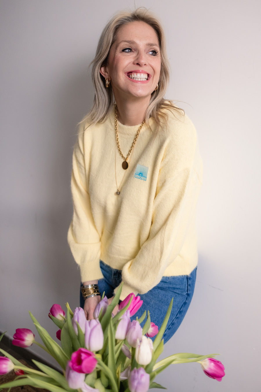 Een fleurige trui in zacht geel dat je direct aan de lente doet denken, de trui is heel zacht en prikt niet.