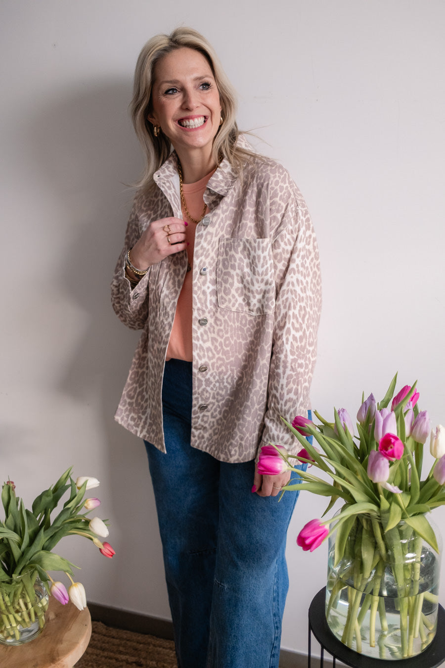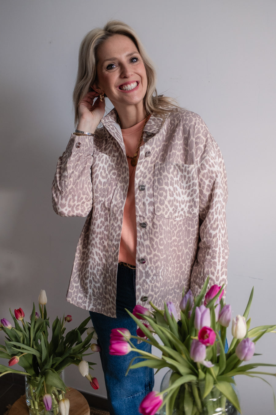 Een prachtig hemdje met leo print, zo mooi voor komende lente. Het hemdje is in een zachte en niet te zware jeansstof, ik draag het met onze Tess sweater!